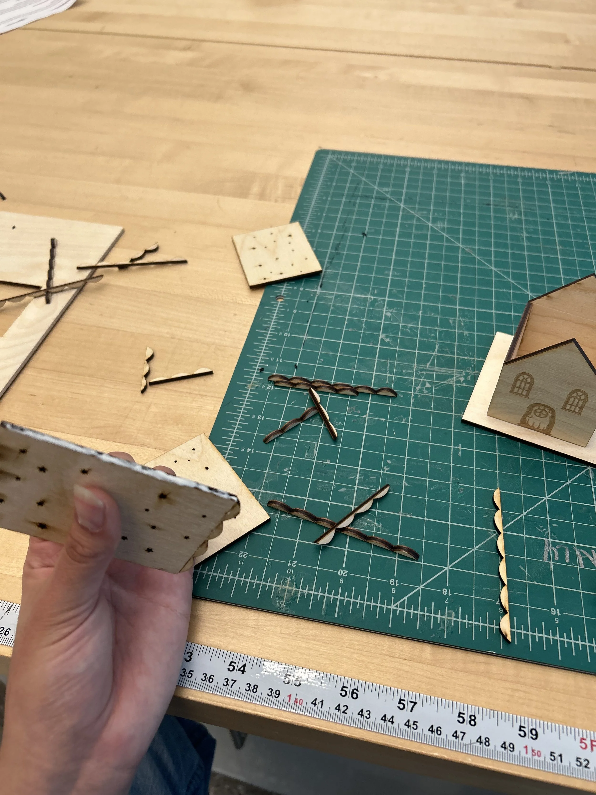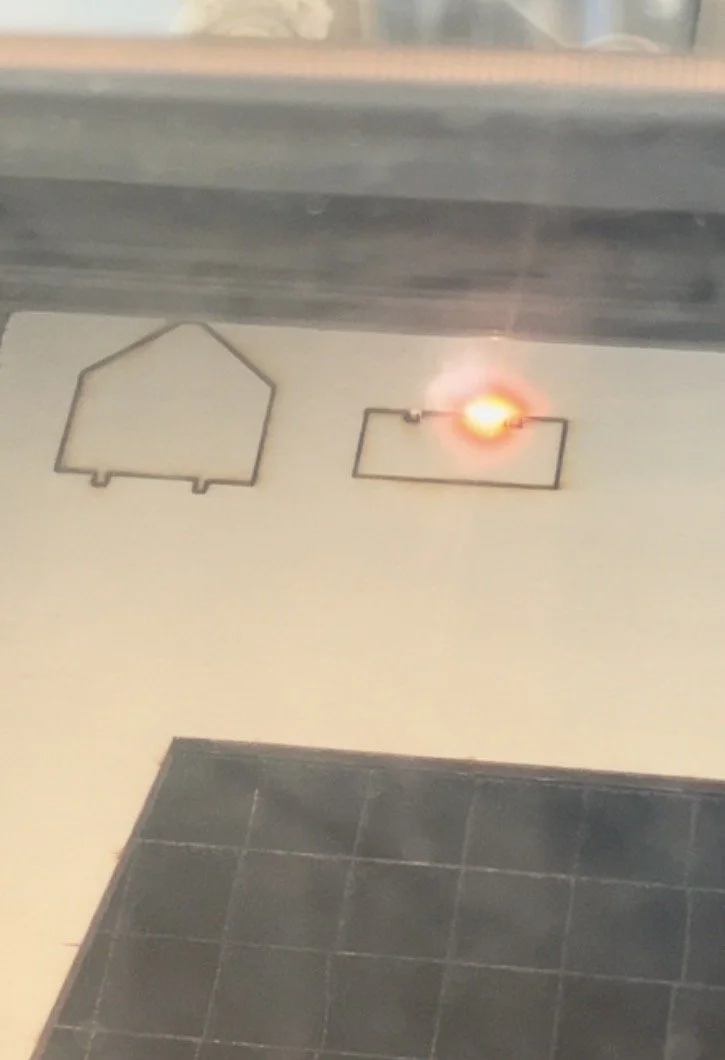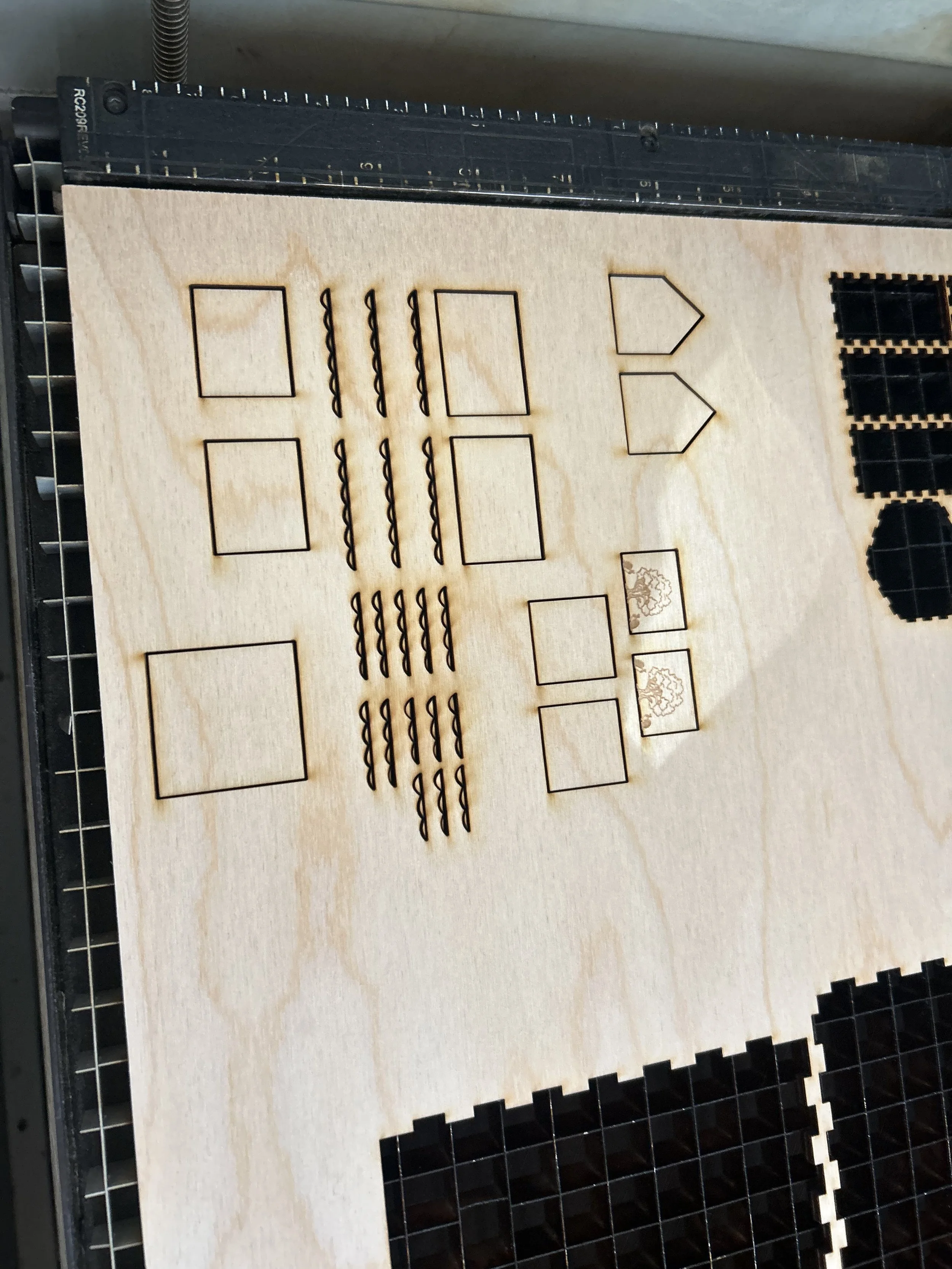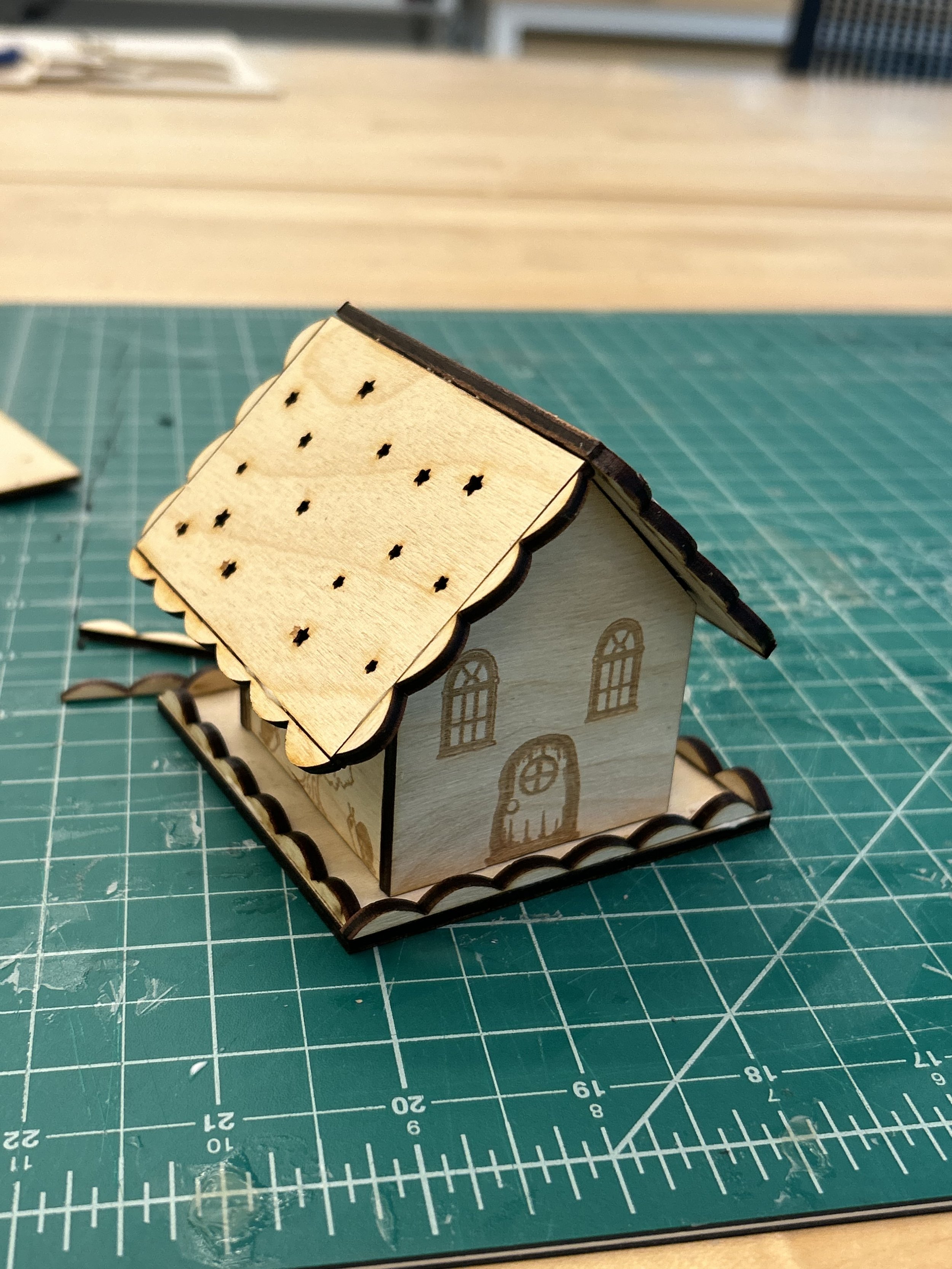 I did a small test cut to see if all the pieces would fit together and to see which roof I liked better. I also tested how my rastered components would look like on the design.