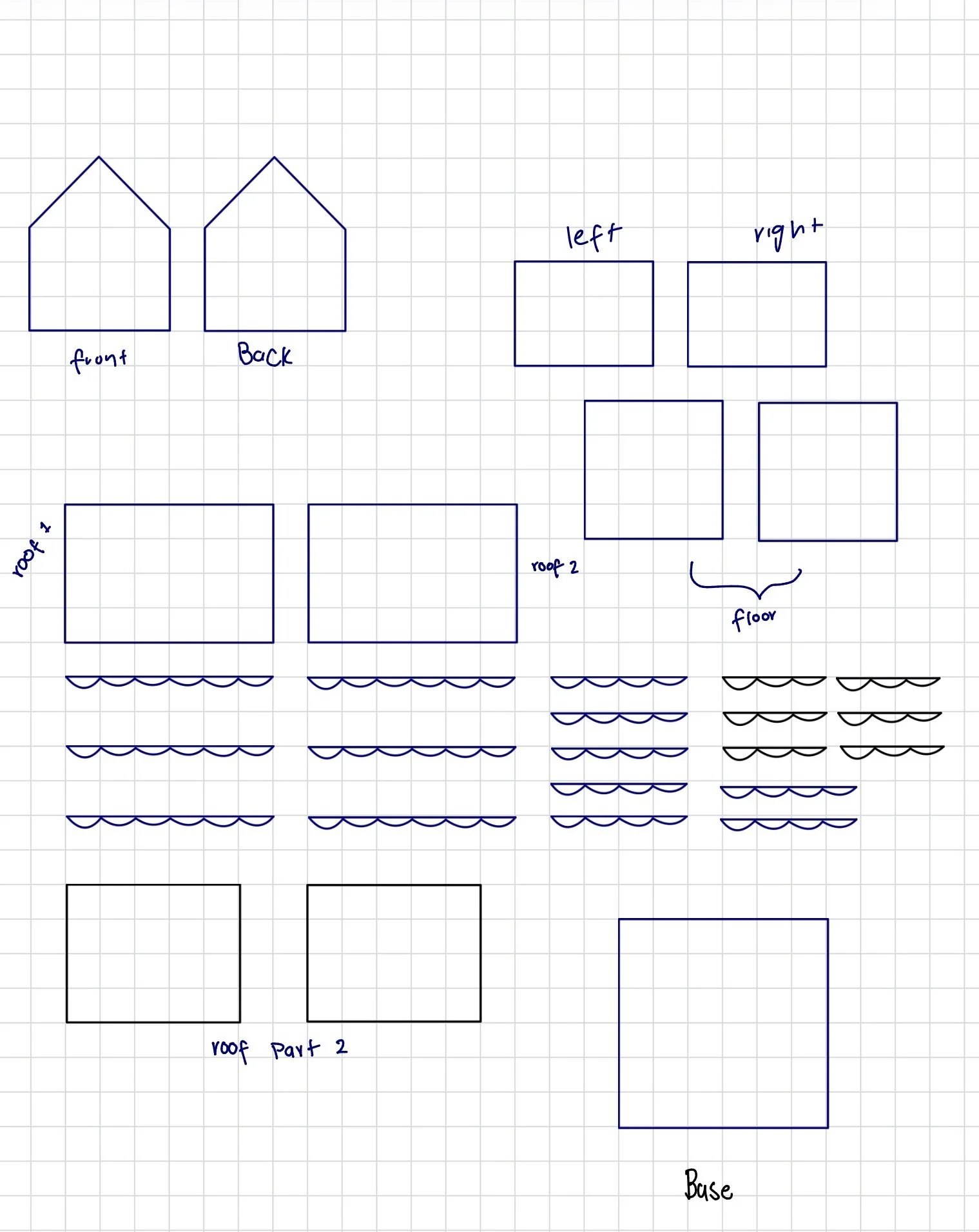 I decided to stick with my original idea of making a house. however, I decided to just draw the pieces by hand instead of using templates on maker case. I used graphing paper as my guide and measured in squares to have a more accurate measurement. I did 2 different measurements for the roof just to see which of the two measurements I would like better.