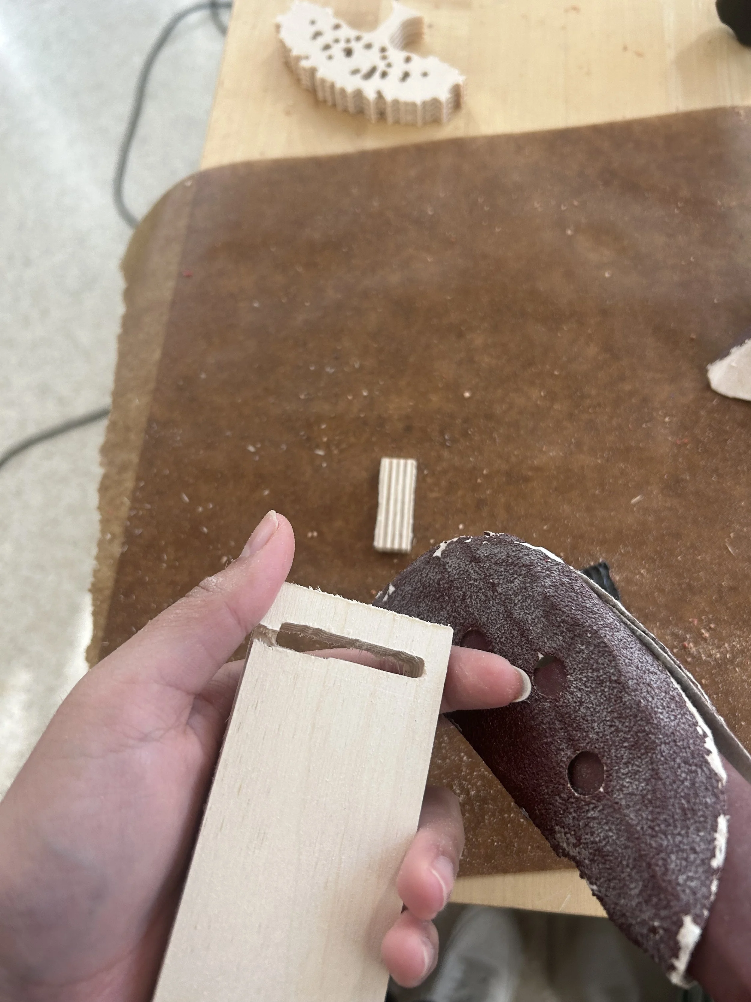 I tried to see if could cut another piece and replace it but nothing was working out so I decided to use the residue of wood and glue it on the random piece that got cut out. I also used a sander to smooth out the middle and see if it would fit.
